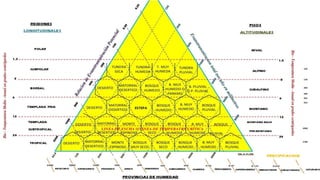 Este documento describe el sistema de zonas de vida de Holdridge, el cual permite clasificar diferentes áreas del mundo en base a parámetros climáticos. Explica las diferentes zonas de vida que existen en Ecuador como el desierto tropical, bosque seco tropical, bosque húmedo tropical, entre otros. Detalla la localización, características climáticas y vegetación de cada zona.