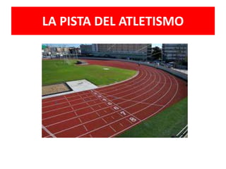 Este documento describe las diferentes zonas y medidas de una pista de atletismo. Explica las áreas para saltos como longitud, triple salto, altura y pértiga, así como las áreas para lanzamientos de disco, martillo, jabalina y peso. También detalla las tres fases de una carrera - contacto, impulso y vuelo - y los pasos de la zancada como impulso, sostén y acción de tronco y brazos.