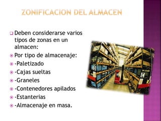 Un almacén debe considerar varias zonas dependiendo del tipo de almacenamiento y rotación de productos. La zona A es para productos de alta rotación y está ubicada cerca de la salida para una fácil expedición. La zona B es para productos de rotación media y está accesible para cargar de forma individual. La zona C es para productos de baja rotación y ocupa un gran volumen del almacén con accesibilidad normal o baja.