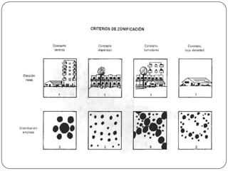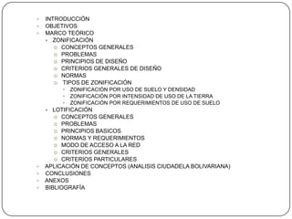 Este documento trata sobre la zonificación y la lotificación en el diseño urbano. Explica que la zonificación divide una ciudad en secciones reservadas para usos específicos como residenciales, comerciales e industriales, con el objetivo de encauzar el desarrollo ordenado de un área. También define conceptos como densidad y presenta normas y criterios de zonificación. Por otro lado, señala que la lotificación debe estar articulada funcionalmente y adaptada al medio natural, presentando diversos tipos como parrilla, andador y cluster