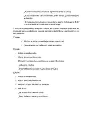 El documento proporciona instrucciones para organizar y codificar un almacén de manera eficiente. Se recomienda demarcar zonas y pasillos con pintura amarilla, y dividir el almacén en zonas según tipo de producto y rotación. La zona A es para productos de alta rotación y fácil acceso, la B para rotación media, y la C para baja rotación y más alejada. Se explica cómo codificar estanterías para optimizar el almacenamiento de cajas de computadoras.