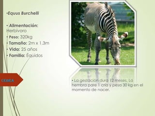 El documento describe las características de varios animales de zoológico, incluyendo cebras, ciervos, zorros grises, jirafas, rinocerontes, leones, cocodrilos, lobos mexicanos, elefantes e hipopótamos. Proporciona detalles sobre su alimentación, tamaño, peso, vida útil y hábitat típico.