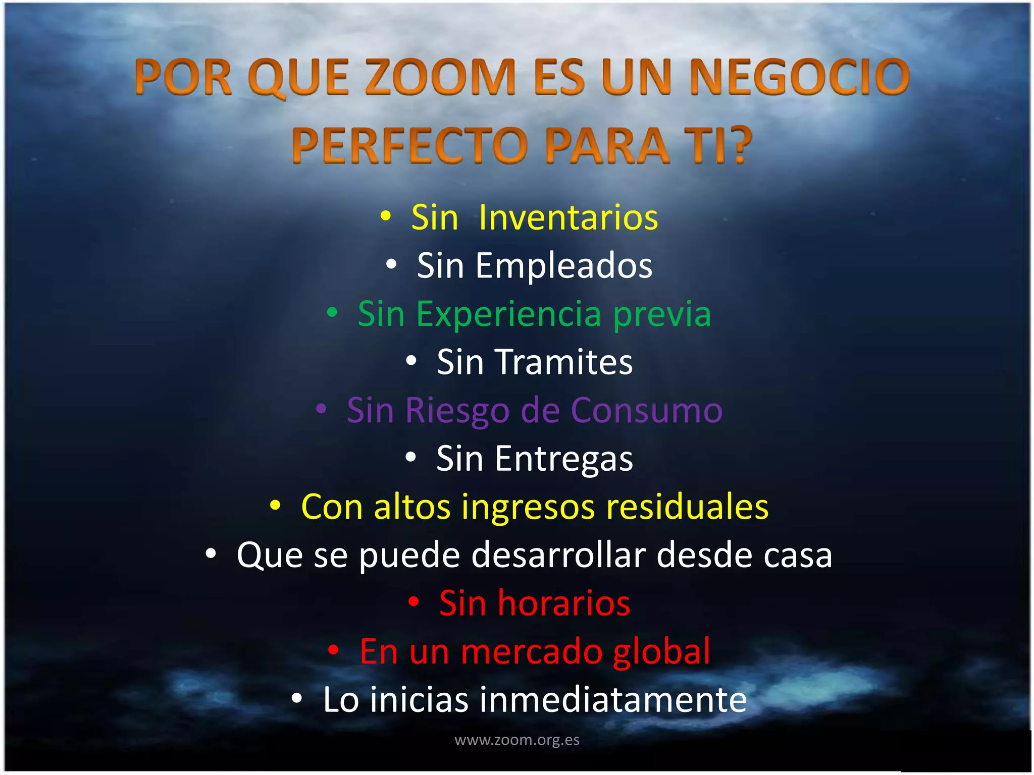 El documento promueve una oportunidad de negocio en línea que no requiere inventarios, empleados, experiencia previa o trámites, y que ofrece altos ingresos residuales trabajando desde casa sin horarios en un mercado global, pudiéndose iniciar inmediatamente a través de www.zoom.org.es.