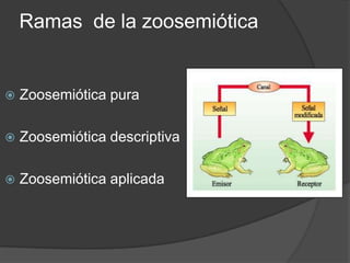 El documento describe las ramas, campos y funciones de la comunicación animal. Explica que la zoosemiótica incluye la zoosemiótica pura, descriptiva y aplicada. Los sistemas de comunicación animal son táctiles, acústicos, químicos y ópticos. Las funciones de la comunicación animal son dar aviso, defensa y reconocimiento entre especies y de forma individual.