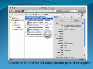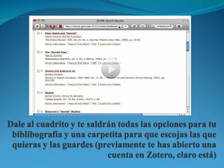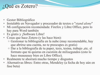 Este documento presenta Zotero, un gestor bibliográfico gratuito y de código abierto que permite organizar referencias bibliográficas, archivos PDF, y notas. Zotero puede sincronizar datos entre dispositivos y ofrece formatos bibliográficos automáticos. El documento explica cómo instalar y utilizar Zotero, sus funciones principales como la búsqueda de texto dentro de PDF, y cómo funciona el plugin de Zotero en procesadores de texto como LibreOffice.