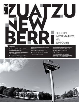 El documento resume varias noticias breves sobre empresas y proyectos en Zuatzu. Una bodega de la D.O. Ribera del Duero está siendo dirigida desde Zuatzu por una empresa de gestión comercial, que ha ayudado a aumentar la producción de la bodega a más de 200,000 botellas. Otra noticia es sobre una operadora móvil vasca que planea lanzar servicios de telefonía móvil de cuarta generación antes de fin de año, convirtiéndose en la primera empresa vasca en cotizar en el mercado altern