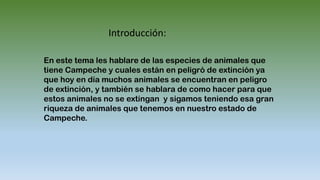 El documento habla sobre las especies de animales terrestres y acuáticos en peligro de extinción en el estado de Campeche en México, incluyendo mamíferos como el mapache, ardilla y mono tepezcuinte, así como peces, crustáceos y reptiles acuáticos o marítimos importantes para la región como el sierra, guachinango, tortugas y lagartos.