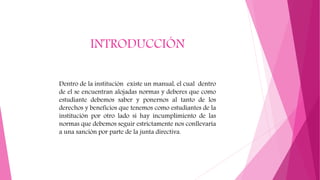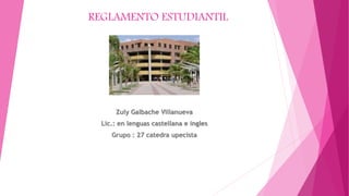 El reglamento estudiantil establece las normas, deberes y derechos de los estudiantes dentro de la institución, regulando su funcionamiento y orientando sobre los beneficios que pueden solicitar. Se describen procedimientos en casos de incumplimiento, como fraude en exámenes o agresiones, así como las sanciones correspondientes. Es fundamental que los estudiantes conozcan este reglamento para asegurar un buen desempeño y gestión en su vida académica.