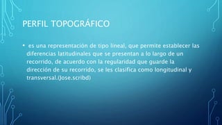 Este documento proporciona instrucciones paso a paso para crear perfiles topográficos en Google Earth Pro. Explica cómo abrir la aplicación, buscar la ubicación deseada, dibujar un polígono para definir el área, seleccionar un color y grosor de línea, y luego generar un perfil de elevación que muestre las diferencias de altitud a lo largo del polígono trazado. Finalmente, instruye guardar el perfil creado.