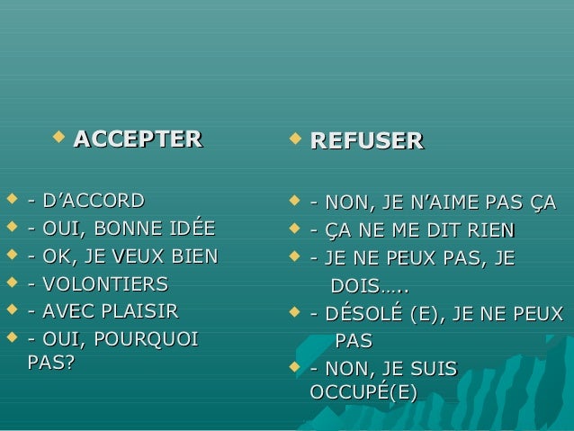 3. 3.  ACCEPTER  REFUSER - D’ACCORD  - NON, JE N’AIME PAS ÇA - OUI, BONNE IDÉE  - ÇA NE ME DIT RIEN - OK, JE VEUX BIEN  - JE NE PEUX PAS, JE - VOLONTIERS DOIS….. - AVEC PLAISIR  - DÉSOLÉ (E), JE NE PEUX - OUI, POURQUOI PAS PAS?  - NON, JE SUIS OCCUPÉ(E)