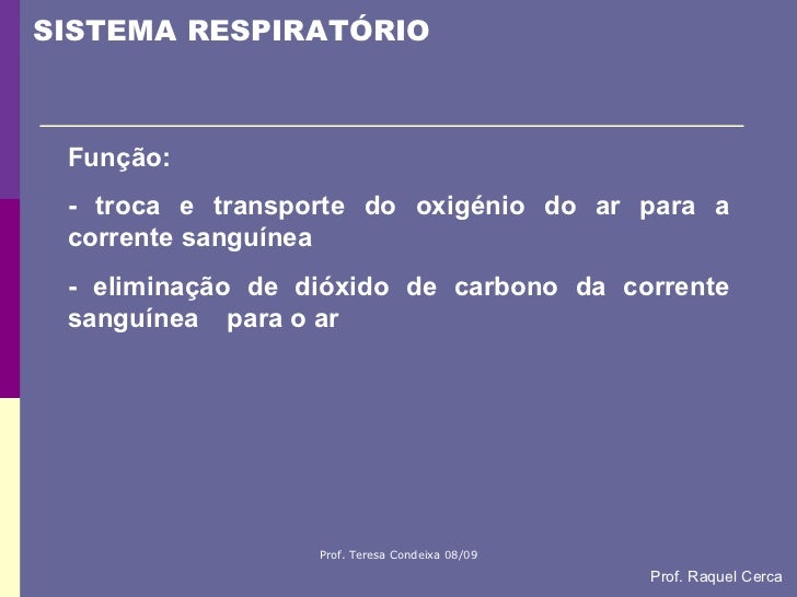 2. 2. SISTEMA RESPIRATÓRIO Função: - troca e transporte do oxigénio do ar para a corrente sanguínea - eliminação de dióxido de carbono da corrente sanguínea para o ar Prof. Raquel Cerca