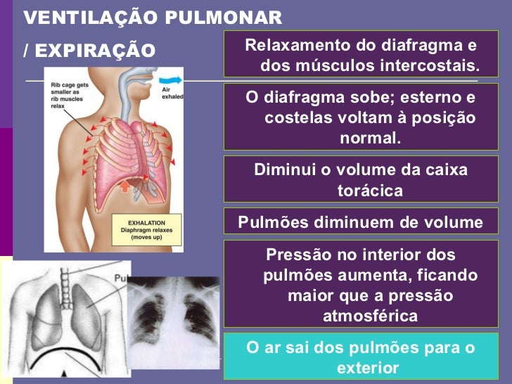 20. 20. VENTILAÇÃO PULMONAR / EXPIRAÇÃO Relaxamento do diafragma e dos músculos intercostais. O diafragma sobe; esterno e costelas voltam à posição normal. Diminui o volume da caixa torácica Pulmões diminuem de volume Pressão no interior dos pulmões aumenta, ficando maior que a pressão atmosférica O ar sai dos pulmões para o exterior