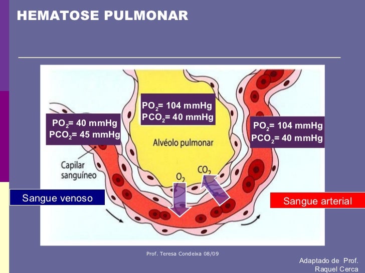 24. 24. HEMATOSE PULMONAR Sangue venoso Sangue arterial PO 2 = 40 mmHg PO 2 = 104 mmHg PO 2 = 104 mmHg PCO 2 = 45 mmHg PCO 2 = 40 mmHg PCO 2 = 40 mmHg Adaptado de Prof. Raquel Cerca
