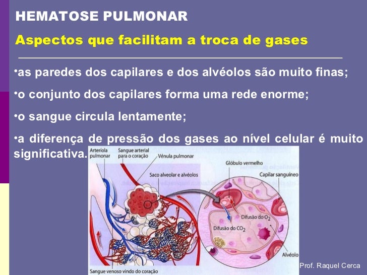 26. 26. HEMATOSE PULMONAR Aspectos que facilitam a troca de gases <ul><li>as paredes dos capilares e dos alvéolos são muito finas; </li></ul><ul><li>o conjunto dos capilares forma uma rede enorme; </li></ul><ul><li>o sangue circula lentamente; </li></ul><ul><li>a diferença de pressão dos gases ao nível celular é muito significativa. </li></ul>Prof. Raquel Cerca