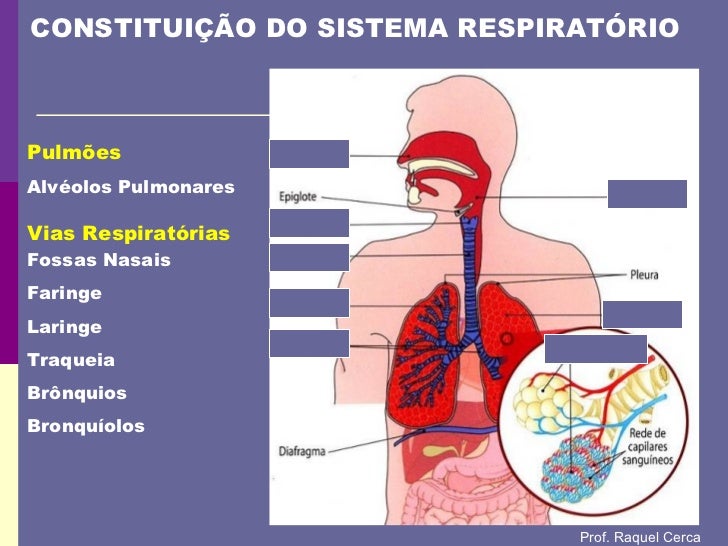 3. 3. CONSTITUIÇÃO DO SISTEMA RESPIRATÓRIO Fossas Nasais Faringe Laringe Traqueia Brônquios Bronquíolos Pulmões Alvéolos Pulmonares Prof. Raquel Cerca Vias Respiratórias
