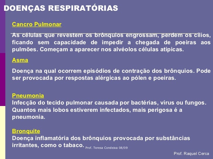 31. 31. DOENÇAS RESPIRATÓRIAS Cancro Pulmonar As células que revestem os brônquios engrossam, perdem os cílios, ficando sem capacidade de impedir a chegada de poeiras aos pulmões. Começam a aparecer nos alvéolos células atípicas. Asma Doença na qual ocorrem episódios de contração dos brônquios. Pode ser provocada por respostas alérgicas ao pólen e poeiras. Pneumonia Infecção do tecido pulmonar causada por bactérias, vírus ou fungos. Quantos mais lobos estiverem infectados, mais perigosa é a pneumonia. Bronquite Doença inflamatória dos brônquios provocada por substâncias irritantes, como o tabaco. Prof. Raquel Cerca