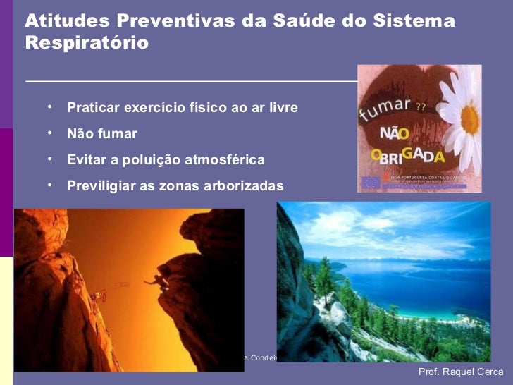 33. 33. Atitudes Preventivas da Saúde do Sistema Respiratório <ul><li>Praticar exercício físico ao ar livre </li></ul><ul><li>Não fumar </li></ul><ul><li>Evitar a poluição atmosférica </li></ul><ul><li>Previligiar as zonas arborizadas </li></ul>Prof. Raquel Cerca