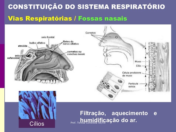 7. 7. CONSTITUIÇÃO DO SISTEMA RESPIRATÓRIO Vias Respiratórias / Fossas nasais Filtração, aquecimento e humidificação do ar. Cílios
