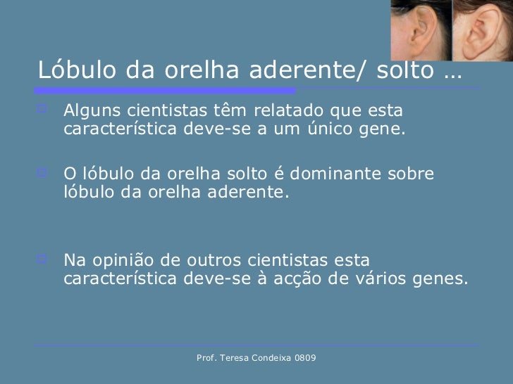 6. 6. Lóbulo da orelha aderente / solto … <ul><li>Os lóbulos da orelha são classificados como aderentes ou soltos. </li></ul><ul><li>O tamanho e aparência dos lóbulos da orelha são também traços hereditários. </li></ul>