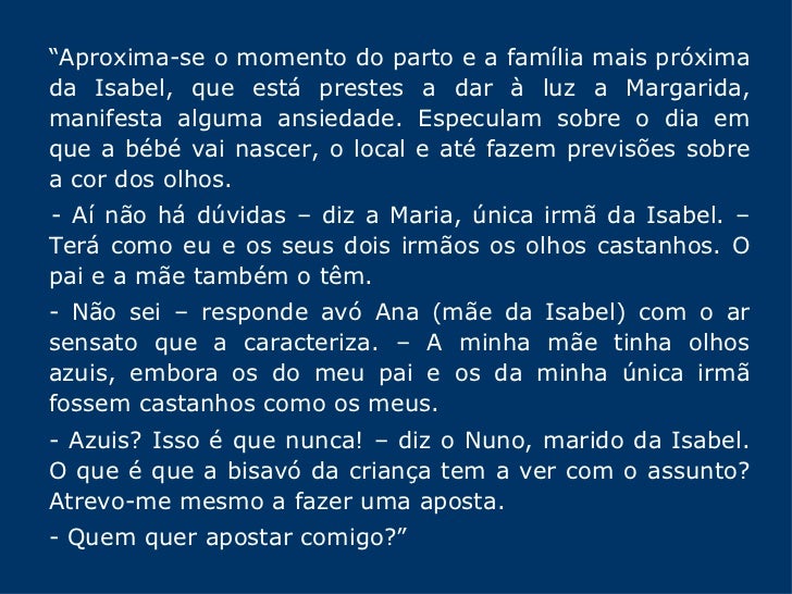 12. 12. <ul><li>“ Aproxima-se o momento do parto e a família mais próxima da Isabel, que está prestes a dar à luz a Margarida, manifesta alguma ansiedade. Especulam sobre o dia em que a bébé vai nascer, o local e até fazem previsões sobre a cor dos olhos. </li></ul><ul><li>- Aí não há dúvidas – diz a Maria, única irmã da Isabel. – Terá como eu e os seus dois irmãos os olhos castanhos. O pai e a mãe também o têm. </li></ul><ul><li>- Não sei – responde avó Ana (mãe da Isabel) com o ar sensato que a caracteriza. – A minha mãe tinha olhos azuis, embora os do meu pai e os da minha única irmã fossem castanhos como os meus. </li></ul><ul><li>- Azuis? Isso é que nunca! – diz o Nuno, marido da Isabel. O que é que a bisavó da criança tem a ver com o assunto? Atrevo-me mesmo a fazer uma aposta. </li></ul><ul><li>- Quem quer apostar comigo?” </li></ul>