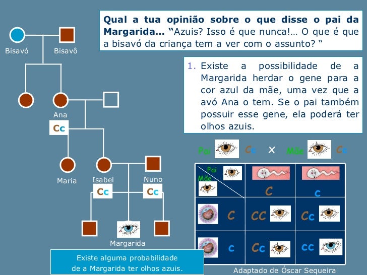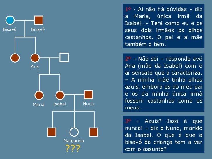 13. 13. Isabel Margarida Maria Ana Bisavó Bisavô Nuno ??? 1º - Aí não há dúvidas – diz a Maria, única irmã da Isabel. – Terá como eu e os seus dois irmãos os olhos castanhos. O pai e a mãe também o têm. 2º - Não sei – responde avó Ana (mãe da Isabel) com o ar sensato que a caracteriza. – A minha mãe tinha olhos azuis, embora os do meu pai e os da minha única irmã fossem castanhos como os meus. 3º - Azuis? Isso é que nunca! – diz o Nuno, marido da Isabel. O que é que a bisavó da criança tem a ver com o assunto?