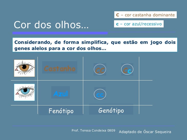 15. 15. Cor dos olhos… Castanho Azul CC cc Fenótipo Genótipo C c C – cor castanha dominante c – cor azul/recessivo Considerando, de forma simplifica, que estão em jogo dois genes alelos para a cor dos olhos… Adaptado de Óscar Sequeira