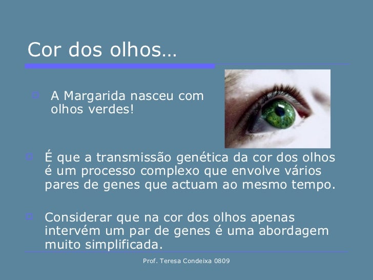 17. 17. Cor dos olhos… <ul><li>É que a transmissão genética da cor dos olhos é um processo complexo que envolve vários pares de genes que actuam ao mesmo tempo. </li></ul><ul><li>Considerar que na cor dos olhos apenas intervém um par de genes é uma abordagem muito simplificada. </li></ul><ul><li>A Margarida nasceu com olhos verdes! </li></ul>