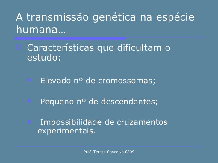 3. 3. A transmissão genética na espécie humana… <ul><li>Características que dificultam o estudo: </li></ul><ul><ul><li>Elevado nº de cromossomas; </li></ul></ul><ul><ul><li>Pequeno nº de descendentes; </li></ul></ul><ul><ul><li>Impossibilidade de cruzamentos experimentais. </li></ul></ul>