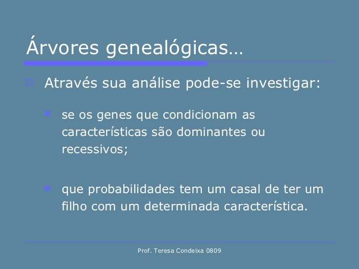 4. 4. Árvores genealógicas… <ul><li>Através sua análise pode-se investigar: </li></ul><ul><ul><li>se os genes que condicionam as características são dominantes ou recessivos; </li></ul></ul><ul><ul><li>que probabilidades tem um casal de ter um filho com um determinada característica. </li></ul></ul>