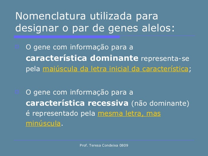5. 5. Nomenclatura utilizada para designar o par de genes alelos: <ul><li>O gene com informação para a característica dominante representa-se pela maiúscula da letra inicial da característica ; </li></ul><ul><li>O gene com informação para a característica recessiva (não dominante) é representado pela mesma letra, mas minúscula . </li></ul>