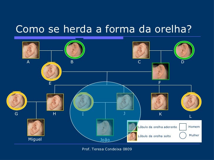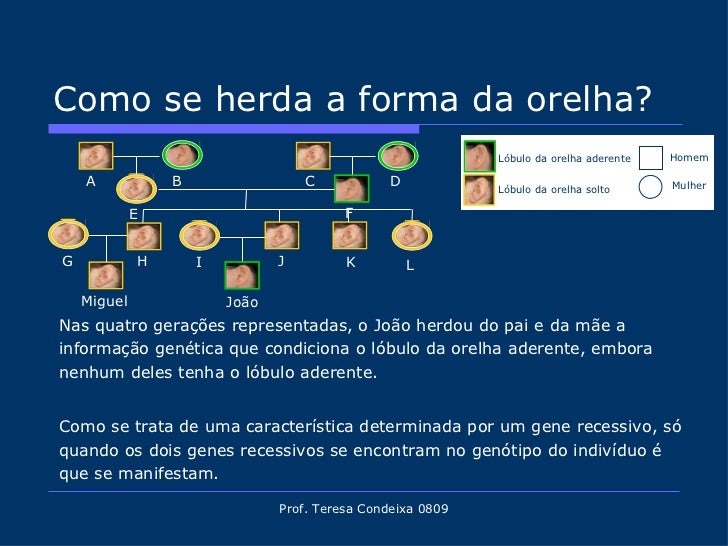 9. 9. Como se herda a forma da orelha? <ul><li>Nas quatro gerações representadas, o João herdou do pai e da mãe a informação genética que condiciona o lóbulo da orelha aderente, embora nenhum deles tenha o lóbulo aderente. </li></ul><ul><li>Como se trata de uma característica determinada por um gene recessivo, só quando os dois genes recessivos se encontram no genótipo do indivíduo é que se manifestam. </li></ul>A B C D E F G H I J K L Miguel João Lóbulo da orelha aderente Lóbulo da orelha solto Homem Mulher