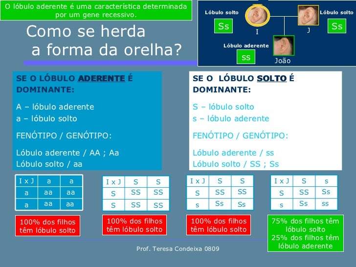 8. 8. Como se herda a forma da orelha? <ul><li>SE O LÓBULO ADERENTE É </li></ul><ul><li>DOMINANTE: </li></ul><ul><li>A – lóbulo aderente </li></ul><ul><li>a – lóbulo solto </li></ul><ul><li>FENÓTIPO / GENÓTIPO: </li></ul><ul><li>Lóbulo aderente / AA ; Aa </li></ul><ul><li>Lóbulo solto / aa </li></ul><ul><li>SE O LÓBULO SOLTO É </li></ul><ul><li>DOMINANTE: </li></ul><ul><li>S – lóbulo solto </li></ul><ul><li>s – lóbulo aderente </li></ul><ul><li>FENÓTIPO / GENÓTIPO: </li></ul><ul><li>Lóbulo aderente / ss </li></ul><ul><li>Lóbulo solto / SS ; Ss </li></ul>100% dos filhos têm lóbulo solto aa Lóbulo solto Lóbulo solto Lóbulo aderente aa aa aa SS SS SS SS 100% dos filhos têm lóbulo solto SS SS Ss Ss 100% dos filhos têm lóbulo solto SS Ss Ss ss 75% dos filhos têm lóbulo solto 25% dos filhos têm lóbulo aderente Ss Ss ss O lóbulo aderente é uma característica determinada por um gene recessivo. a a a a I x J I J João s S S S I x J s S s S I x J S S S S I x J