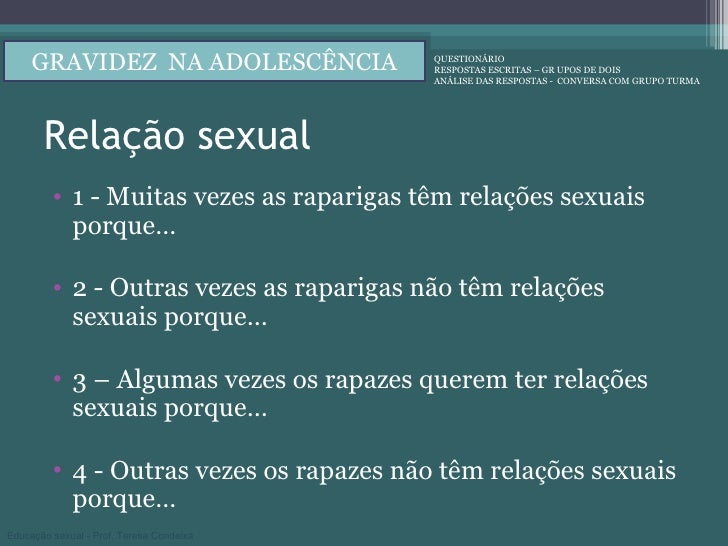 10. 10. Relação sexual 1 - Muitas vezes as raparigas têm relações sexuais porque… 2 - Outras vezes as raparigas não têm relações sexuais porque… 3 – Algumas vezes os rapazes querem ter relações sexuais porque… 4 - Outras vezes os rapazes não têm relações sexuais porque… GRAVIDEZ NA ADOLESCÊNCIA QUESTIONÁRIO RESPOSTAS ESCRITAS – GR UPOS DE DOIS ANÁLISE DAS RESPOSTAS - CONVERSA COM GRUPO TURMA Educação sexual - Prof. Teresa Condeixa
