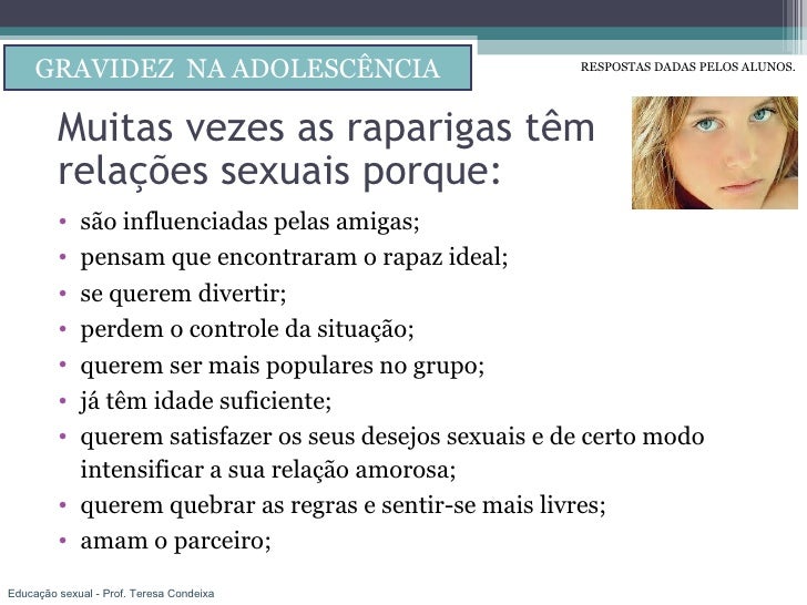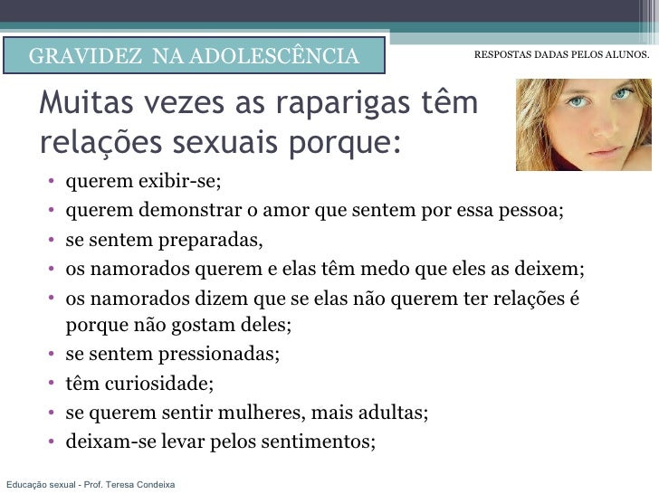 11. 11. Muitas vezes as raparigas têm relações sexuais porque: querem exibir-se; querem demonstrar o amor que sentem por essa pessoa; se sentem preparadas, os namorados querem e elas têm medo que eles as deixem; os namorados dizem que se elas não querem ter relações é porque não gostam deles; se sentem pressionadas; têm curiosidade; se querem sentir mulheres, mais adultas; deixam-se levar pelos sentimentos; GRAVIDEZ NA ADOLESCÊNCIA RESPOSTAS DADAS PELOS ALUNOS. Educação sexual - Prof. Teresa Condeixa