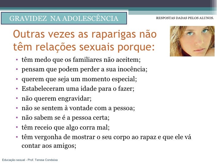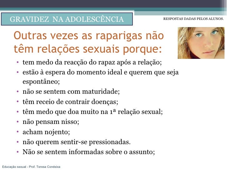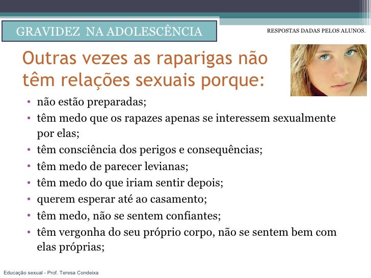 15. 15. Outras vezes as raparigas não têm relações sexuais porque: tem medo da reacção do rapaz após a relação; estão à espera do momento ideal e querem que seja espontâneo; não se sentem com maturidade; têm receio de contrair doenças; têm medo que doa muito na 1ª relação sexual; não pensam nisso; acham nojento; não querem sentir-se pressionadas. Não se sentem informadas sobre o assunto; GRAVIDEZ NA ADOLESCÊNCIA RESPOSTAS DADAS PELOS ALUNOS. Educação sexual - Prof. Teresa Condeixa