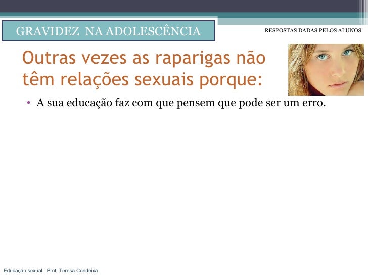 16. 16. Outras vezes as raparigas não têm relações sexuais porque: A sua educação faz com que pensem que pode ser um erro. GRAVIDEZ NA ADOLESCÊNCIA RESPOSTAS DADAS PELOS ALUNOS. Educação sexual - Prof. Teresa Condeixa