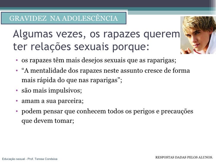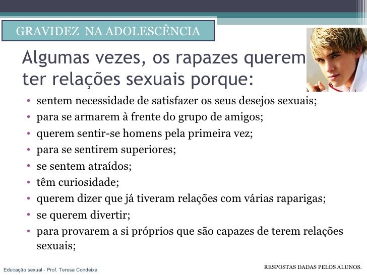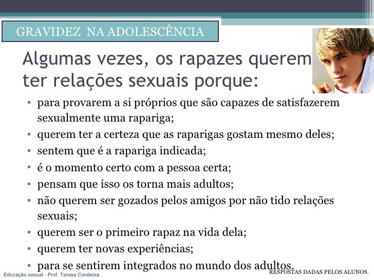 17. 17. Algumas vezes, os rapazes querem ter relações sexuais porque: sentem necessidade de satisfazer os seus desejos sexuais; para se armarem à frente do grupo de amigos; querem sentir-se homens pela primeira vez; para se sentirem superiores; se sentem atraídos; têm curiosidade; querem dizer que já tiveram relações com várias raparigas; se querem divertir; para provarem a si próprios que são capazes de terem relações sexuais; GRAVIDEZ NA ADOLESCÊNCIA RESPOSTAS DADAS PELOS ALUNOS. Educação sexual - Prof. Teresa Condeixa