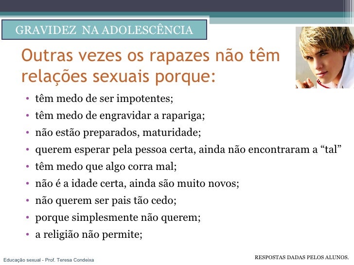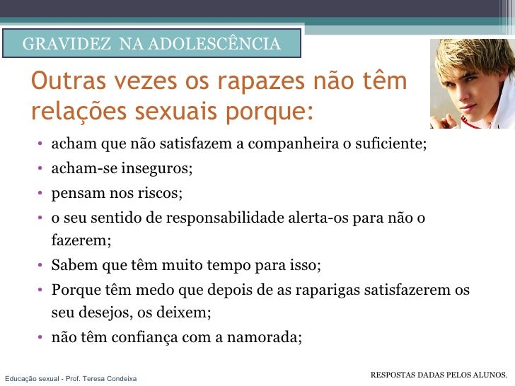 21. 21. Outras vezes os rapazes não têm relações sexuais porque: acham que não satisfazem a companheira o suficiente; acham-se inseguros; pensam nos riscos; o seu sentido de responsabilidade alerta-os para não o fazerem; Sabem que têm muito tempo para isso; Porque têm medo que depois de as raparigas satisfazerem os seu desejos, os deixem; não têm confiança com a namorada; GRAVIDEZ NA ADOLESCÊNCIA RESPOSTAS DADAS PELOS ALUNOS. Educação sexual - Prof. Teresa Condeixa