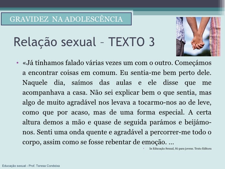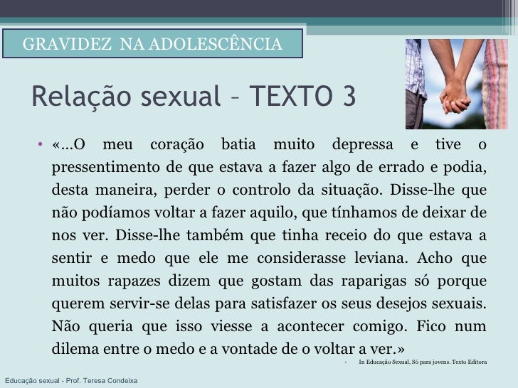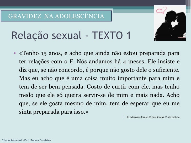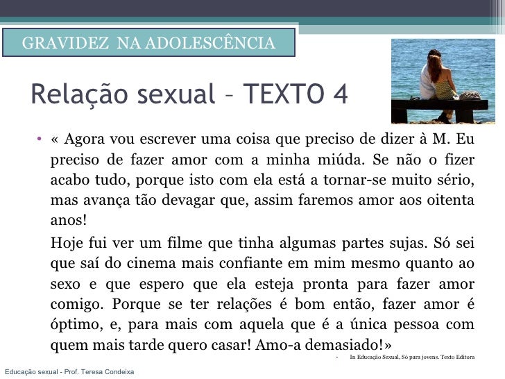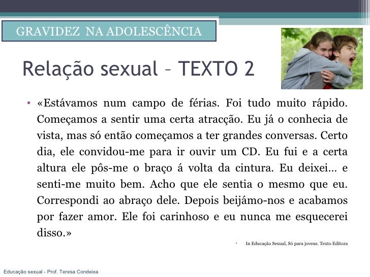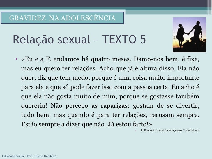4. 4. Relação sexual - TEXTO 1 «Tenho 15 anos, e acho que ainda não estou preparada para ter relações com o F. Nós andamos há 4 meses. Ele insiste e diz que, se não concordo, é porque não gosto dele o suficiente. Mas eu acho que é uma coisa muito importante para mim e tem de ser bem pensada. Gosto de curtir com ele, mas tenho medo que ele só queira servir-se de mim e mais nada. Acho que, se ele gosta mesmo de mim, tem de esperar que eu me sinta preparada para isso.» In Educação Sexual, Só para jovens. Texto Editora GRAVIDEZ NA ADOLESCÊNCIA Educação sexual - Prof. Teresa Condeixa