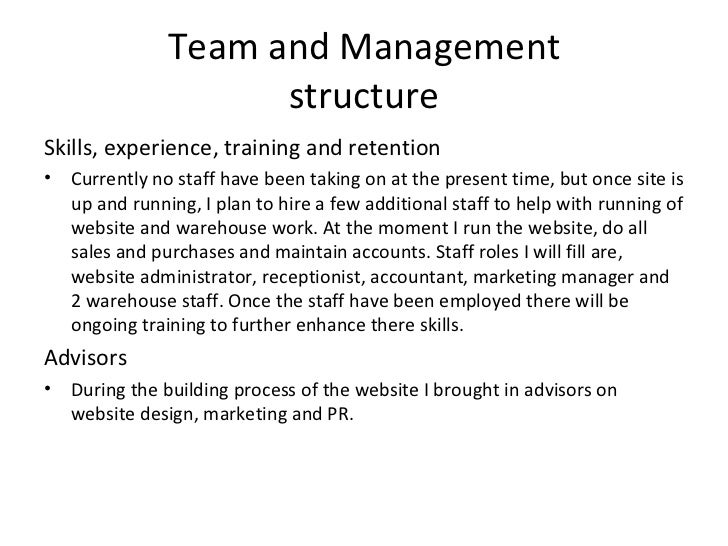 12. 12. Team and Management structure <ul><li>Skills, experience, training and retention </li></ul><ul><li>Currently no staff have been taking on at the present time, but once site is up and running, I plan to hire a few additional staff to help with running of website and warehouse work. At the moment I run the website, do all sales and purchases and maintain accounts. Staff roles I will fill are, website administrator, receptionist, accountant, marketing manager and 2 warehouse staff. Once the staff have been employed there will be ongoing training to further enhance there skills. </li></ul><ul><li>Advisors </li></ul><ul><li>During the building process of the website I brought in advisors on website design, marketing and PR. </li></ul>