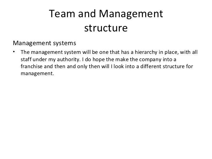13. 13. Team and Management structure <ul><li>Management systems </li></ul><ul><li>The management system will be one that has a hierarchy in place, with all staff under my authority. I do hope the make the company into a franchise and then and only then will I look into a different structure for management. </li></ul>