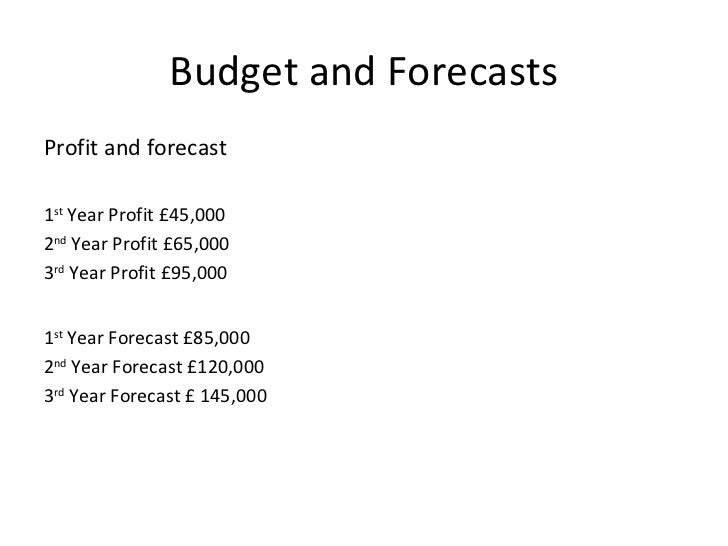 14. 14. Budget and Forecasts <ul><li>Profit and forecast </li></ul><ul><li>1 st Year Profit £45,000 </li></ul><ul><li>2 nd Year Profit £65,000 </li></ul><ul><li>3 rd Year Profit £95,000 </li></ul><ul><li>1 st Year Forecast £85,000 </li></ul><ul><li>2 nd Year Forecast £120,000 </li></ul><ul><li>3 rd Year Forecast £ 145,000 </li></ul>
