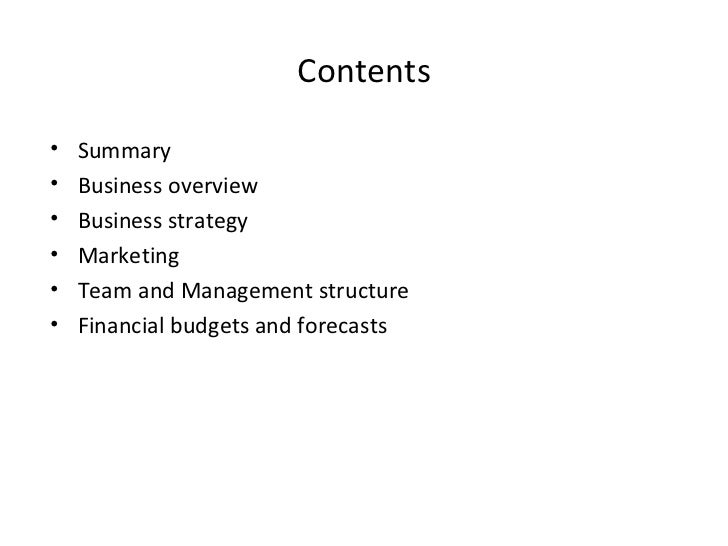 2. 2. Contents <ul><li>Summary </li></ul><ul><li>Business overview </li></ul><ul><li>Business strategy </li></ul><ul><li>Marketing </li></ul><ul><li>Team and Management structure </li></ul><ul><li>Financial budgets and forecasts </li></ul>