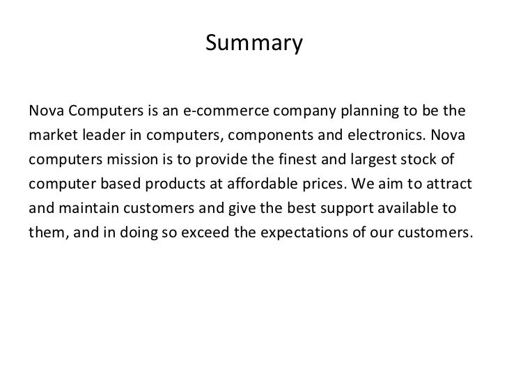 3. 3. Summary <ul><li>Nova Computers is an e-commerce company planning to be the </li></ul><ul><li>market leader in computers, components and electronics. Nova </li></ul><ul><li>computers mission is to provide the finest and largest stock of </li></ul><ul><li>computer based products at affordable prices. We aim to attract </li></ul><ul><li>and maintain customers and give the best support available to </li></ul><ul><li>them, and in doing so exceed the expectations of our customers. </li></ul>