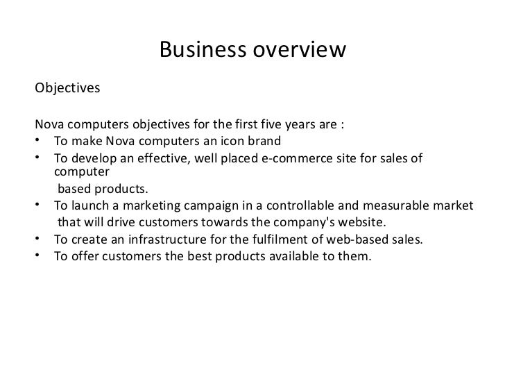 4. 4. Business overview <ul><li>Objectives </li></ul><ul><li>Nova computers objectives for the first five years are : </li></ul><ul><li>To make Nova computers an icon brand </li></ul><ul><li>To develop an effective, well placed e-commerce site for sales of computer </li></ul><ul><li>based products. </li></ul><ul><li>To launch a marketing campaign in a controllable and measurable market </li></ul><ul><li>that will drive customers towards the company's website. </li></ul><ul><li>To create an infrastructure for the fulfilment of web-based sales. </li></ul><ul><li>To offer customers the best products available to them. </li></ul>