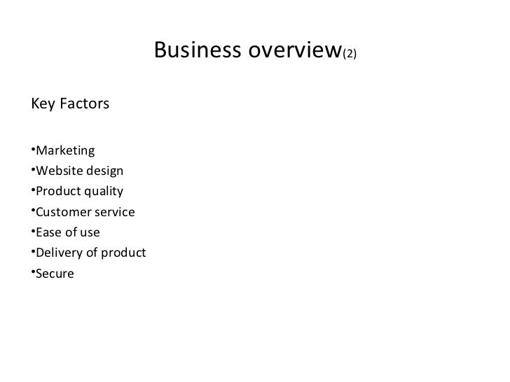 5. 5. <ul><li>Key Factors </li></ul><ul><li>Marketing </li></ul><ul><li>Website design </li></ul><ul><li>Product quality </li></ul><ul><li>Customer service </li></ul><ul><li>Ease of use </li></ul><ul><li>Delivery of product </li></ul><ul><li>Secure </li></ul>Business overview (2)