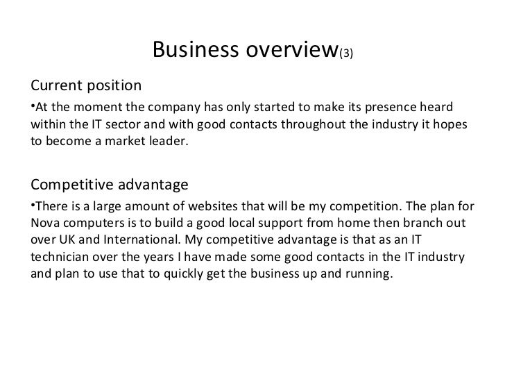 6. 6. <ul><li>Current position </li></ul><ul><li>At the moment the company has only started to make its presence heard within the IT sector and with good contacts throughout the industry it hopes to become a market leader. </li></ul><ul><li>Competitive advantage </li></ul><ul><li>There is a large amount of websites that will be my competition. The plan for Nova computers is to build a good local support from home then branch out over UK and International. My competitive advantage is that as an IT technician over the years I have made some good contacts in the IT industry and plan to use that to quickly get the business up and running. </li></ul>Business overview (3)