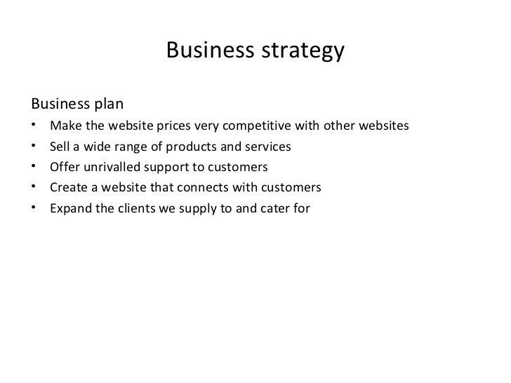 7. 7. Business strategy <ul><li>Business plan </li></ul><ul><li>Make the website prices very competitive with other websites </li></ul><ul><li>Sell a wide range of products and services </li></ul><ul><li>Offer unrivalled support to customers </li></ul><ul><li>Create a website that connects with customers </li></ul><ul><li>Expand the clients we supply to and cater for </li></ul>
