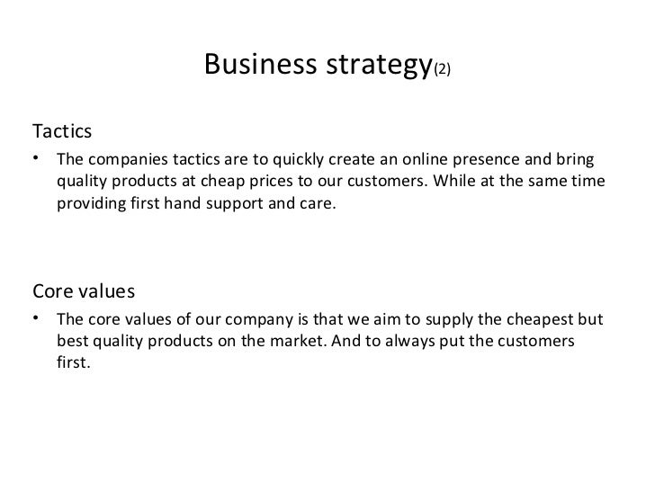8. 8. Business strategy (2) <ul><li>Tactics </li></ul><ul><li>The companies tactics are to quickly create an online presence and bring quality products at cheap prices to our customers. While at the same time providing first hand support and care. </li></ul><ul><li>Core values </li></ul><ul><li>The core values of our company is that we aim to supply the cheapest but best quality products on the market. And to always put the customers first. </li></ul>