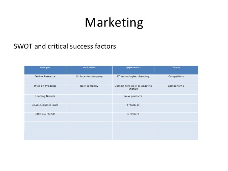 9. 9. Marketing <ul><li>SWOT and critical success factors </li></ul>Strengths Weaknesses Opportunities Threats Online Presence No face for company IT technologies changing Competitors Price on Products New company Competitors slow to adapt to change Components Leading Brands New products Good customer skills Franchise Little overheads   Members